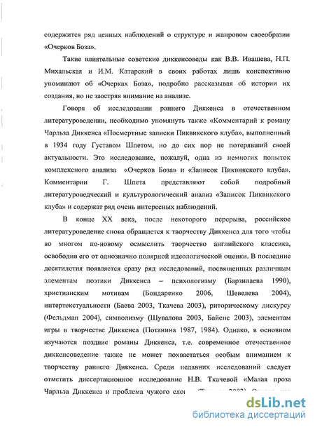 В рамках нашего исследования мы ограничимся лишь кратким обзором работ, посвященных исследованиям раннего творчества Диккенса,.а именно его первого сборника «Очерки Боза» и первого романа «Записки Пиквикского клуба».