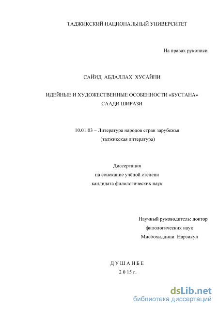 Актуальность темы исследования. Персидско-таджикская поэзия, имеющая всемирную славу в течение более тысячилетней истории своего развития подарила сокровищнице мировой культуры генальные художественные произведения суфийско-дидактического содержания, такие как "Хадикат ал-хакика" ("Сад истины") Санаи Газневи, "Махзан ал-асрар" ("Сокровищница тайн") Низами Гянджеви, "Мантик ат-тайр" ("Язык птиц"), "Асрар-наме" ("Книга тайн") Фаридаддина Аттара, "Меснави ма'нави" («Духовное месневи») Джалаладдина Руми и т.д. К числу шедевров средневековой поэзии на фарси относится и «Бустан» Саади, являющийся бесподобным сокровищем в сокровищнице мировой литературы. В течении столетий в связи с появлением новых взглядов и воззрений в исследованиях по литературе, появлением новых направлений и школ в изучении художественных литературных памятников, творения Саади всегда шагают в ногу со временем, его вечные поучения, особенно его воспитательные и нравоучительные воззрения, отвечают и современным требованиям мировой общественности.