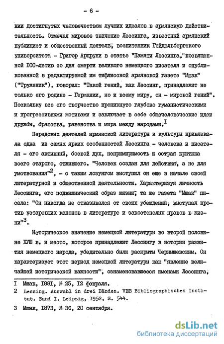 Типологически армянские просветители XIX в. приближались к такому восприятию творчества и личности Лессинга, разумеется, с учетом конкретно-исторических условий и национальных особенностей развития армянской литературы и общественной мысли. Идеи Лессинга, писателя и мыслителя, были близки и понятны армянским просветителям. Многие из них получив образование в лучших университетах России и Западной Европы (в том числе и в Германии), проникались, наряду с идеями русских просветителей; идеями немецкого Просвещения - Лессинга, Гете, Шиллера. Просвещение они усматривали во внедре - 6 ний достигнутых человечеством лучших идеалов-В армянскую действительность. Отмечая мировое значение Лессинга, известный армянский публицист и общественный деятель-, воспитанник Гейдельбергского университета - Григор Арцруни в статье "Памяти Лессинга,"посвященной 100-летию со дня смерти великого немецкого писателя и опубликованной в редактируемой им тифлисской армянской газете "Мшак" ("Труженик"), говорил: "Такой гений, как Лессинг, принадлежит не только его родине - Германии, но и всему миру, он - мировой гений". Поскольку все его творчество проникнуто глубоко гуманистическими и прогрессивными мотивами и заключает в себе общечеловеческие идеи дружбы, братства, равенства и мира между народами.