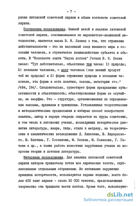 Постановка исследования. Важной вехой в анализе литовской советской лирики, основывающемся на марксистско-ленинской методологии, является мысль В. И. Ленина о том, что отражение действительности - это не пассивный след внешнего мира в сознании человека, а ступенчатое взаимодействие субъекта и объекта. В "Конспекте книги "Наука логики" Гегеля В. И. Ленин писал: "Тут действительно, объективно три члена: I) природа; 2) познание человека, = мозг человека (как высший продукт той же природы) и 3) форма отражения природы в познании человека, эта форма и есть понятия, законы, категории etc." /484, 164/. Следовательно, существует форма превращения субъективности в объективность; объектированная форма не случайна, не аморфна. Это - структура, организованная по определенным законам, правилам и принципам. Устанавливая теоретические и методологические предпосылки и избирая способ конкретного анализа, автор в первую очередь опирается на труды советских, в том числе и литовских ученых, исследующих историческое развитие литературы, жанры, типы, стили и метрику, на теоретические и аналитические исследования Д. Лихачева, В. Жирмунского, М. Бахтина, Г. Поспелова, М. Кагана, М. Полякова, Г. Га-чева и др., а также работы известных зарубежных ученых по вопросам теории и поэтики литературы.