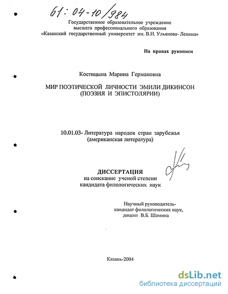 диссертации идет о поэтических принципах Эмили Дикинсон. Автор