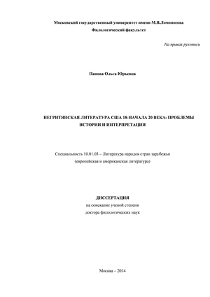 Структура исследования. Работа состоит из введения, четырех глав, заключения, библиографии и приложений. Введение посвящено истории вопроса; в первой главе «18 век: формирование культурной модели черной расы и первые памятники негритянской словесности» рассматриваются и анализируются истоки негритянской словесности и литературы, возникновение культурной модели черной расы и соответствующей топики в англо-американской литературной традиции, начало ее рецепции в первых образцах негритянской литературы, а также освоение литературных, в том числе жанровых конвенций европейско-американской литературы. Вторая глава «Негритянская словесность 1800-1865 гг.: интроекция культурной модели черной расы и становление художественной прозы» посвящена становлению негритянской литературной традиции в условиях тесного взаимодействия с плантаторско-менестрельной традицией и аболиционистской литературой, усвоению и развитию культурной модели черной расы и «расовой топики» в белой и негритянской литературе первой половины 19 века. Третья («Трансформация культурной модели черной расы в литературе рубежа 19-20 вв.») и четвертая («В преддверии негритянского ренессанса: начало обновления культурной модели») главы посвящены литературному процессу рубежа 19-20 вв. Здесь трансформация культурной модели черной расы, топики, жанровых и стилевых конвенций анализируются в тесной связи с социально-историческими (отмена рабства, реконструкция Юга, расовая война, рост иммиграции, евгенические исследования, социальное расслоение и миграция негритянского населения), культурными и литературными (роль традиции благопристойности, регионализма, социального реализма, натурализма, и становящегося модернизма) факторами, способствовавшими обновлению модели 18-19 вв., процессу поиска и утверждения самобытной расово-культурной идентичности в негритянской литературе. Последний параграф четвертой главы «Негритянский ренессанс: проблемы изучения» написан в форме очерка, цель которого – обрисовать перспективу взгляда на негритянский ренессанс 1920-30-х гг. исходя из логики предшествующего развития черной литературной традиции. Заключение подводит итоги и содержит основные выводы работы. Библиография, включающая источники и научные исследования, состоит из 877 позиций. В Приложении 1 приведен список наиболее известных и репрезентативных романов 19-начала 20 вв., полемически направленных против «Хижины дяди Тома» Г.Бичер-Стоу; в Приложении 2 помещены краткие содержания основных произведений негритянских авторов исследуемого периода.