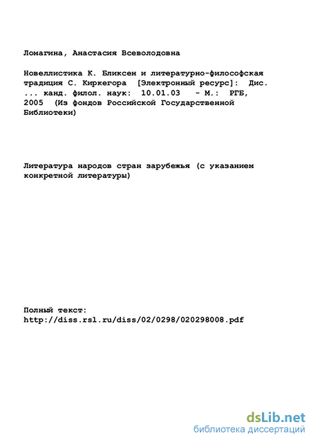 - Рецепция произведений С.Киркегора в художественном сознании К.Бликсен