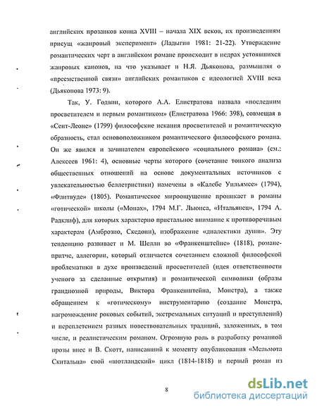 английских прозаиков конца XVIII - начала XIX веков, их произведениям присущ «жанровый эксперимент» (Ладыгин 1981: 21-22). Утверждение романтических черт в английском романе происходит в недрах устоявшихся жанровых канонов, на что указывает и Н.Я. Дьяконова, размышляя о «преемственной связи» английских романтиков с идеологией XVIII века (Дьяконова 1973:9).