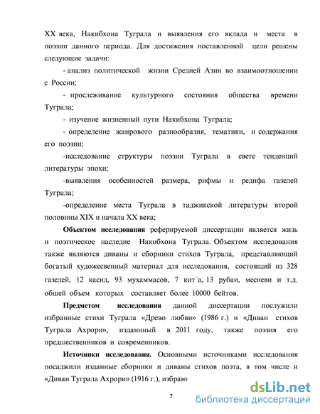 Цель и задачи исследования. Основной целью реферируемой работы является исследование поэтики газелей Накибхона Туграла. Цель исследования также основывает изучения биографии Туграла и художественно-эстетических особенностей его газельного творчества. Для достижения указанный цели в диссертации предприняты попытки решения следующих задач:
