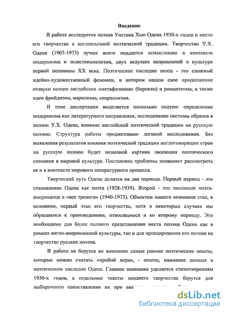 В теме диссертации выделяется несколько подтем: определение модернизма как литературного направления, исследование системы образов в поэзии У.Х. Одена, влияние английской поэтической традиции на русскую поэзию. Структура работы продиктовано логикой исследования. Без выявления результатов влияния поэтической традиции англоговорящих стран на русскую поэзию будет неполной картина эволюции поэтического сознания в мировой культуре. Постановка проблемы позволяет рассмотреть ее и в контексте мирового литературного процесса.