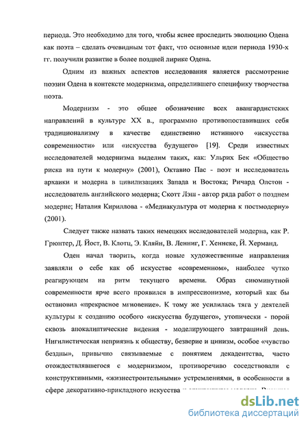 группировок в рамках модернизма в Англии, выявлению общих типологических черт произведений модернистов. Помимо этого, исследование представляет собой одну попытку оценить влияние У.Х. Одена на русскую поэзию.