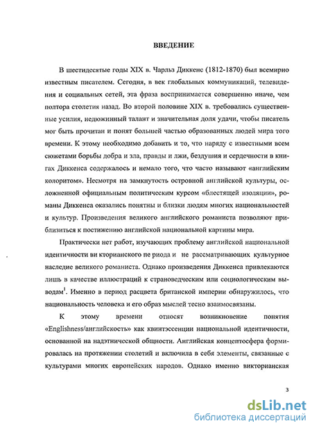Художественный мир Ч. Диккенса явился наиболее полным выражением представлений о национальной идентичности англичан в эпоху викториан-ства. При этом масштабность писательского таланта, мощь гражданского темперамента и высокий общественный авторитет Ч. Диккенса дали ему возможность акцентировать в сознании современников основополагающие национальные ценности и тем самым участвовать в непрерывном процессе воспроизводства «ан-глийскости».
