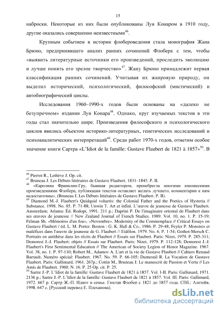 Началом нового этапа в изучении раннего творчества Флобера стали 1960-е годы. К этому времени Национальная библиотека Франции приобрела большую часть рукописей, и литературоведам стали известны произведения исторического, психологического и философского циклов. Крупным событием в истории флобероведения явилась опубликованная в 1963 году монография Ж. Брюно, предпринявшего анализ ранних сочинений с тем, чтобы выявить их литературные источники, проследить жанровую эволюцию и лучше понять зрелое творчество писателя4. Среди работ 1970-х гг. отметим значение книги Сартра «L’Idiot de la famille: Gustave Flaubert de 1821 1857»5. Философ продолжил в ней размышления над вопросом «Что можно знать сегодня о человеке?», начатые в эссе «Проблема метода». Ранняя проза Флобера была для него ключом к пониманию творческой личности. Вместе с тем трактовка Сартром экзистенциального опыта Флобера, его представлений о феномене бесконечности, истине, знании, вере, воплощенных в ранних произведениях, имеет бесспорную и непреходящую ценность. Со временем круг изучаемых текстов становился шире. Новеллы философского и психологического циклов явились объектом историко-литературных, генетических исследований и психоаналитических интерпретаций в работах М.-Ж Диамон, П. Даприни, П. Фейера, М. Робер, А. Наамана, М. Коттен, Ш. Фелман, М. Гинзбург, Э. Ганса, Ж. Фройлиш, А. Рубино. К поэтике ранней прозы в связи с проблемами эстетики и мировоззрения Флобера в эти годы обращались В. Бромбер, Р. Гриффин, Ж.-Л. Душен, И. Леклерк, Ж. Сежанже, А. Швейгер. Значительным явлением стала посвященная мистическому циклу ранней прозы книга Т. Анвина «Искусство и бесконечность. Раннее творчество Гюстава Флобера»6. Но главным объектом исследования 19601990-х гг. по-прежнему оставались автобиографические повести и автобиографическое начало в них.