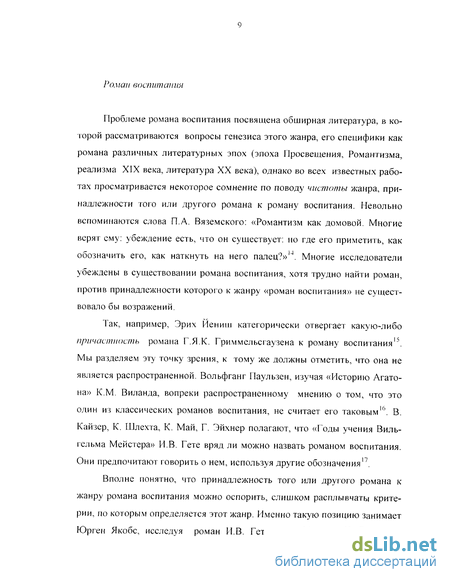 Э.Т.А. Гофмана. В сущности, складывается достаточно драматическая ситуация в определении этого жанра. Многое зависит от взгляда исследователя на эту проблему (проблему жанра романа воспитания). В самом деле, любой роман имеет какие-то особенности, которые можно идентифицировать как элементы романа воспитания, в целом же данное произведение вряд ли можно классифицировать как роман воспитания. Понятно, что в природе чистых явлений не бывает, однако же в представлении и исследовании романа воспитания отмечается субъективизм. Направленность исследований, а иногда и их результат зависят от того, как понимают сами исследователи этот термин, какие романы выбирают и изучают в свете теории романа воспитания.