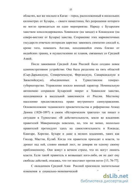 После завоевания Средней Азии Россией было создано новое административное устройство. Она была разделена на пять областей (Сыр-Дарьинскую, Семиреченскую, Ферганскую, Самаркандскую и Закаспийскую), объединенных в Туркестанское генерал-губернаторство. Управление носило военный характер. Номинальную автономию сохраняли Бухарский эмират и Хивинское ханство, находившиеся в вассальной зависимости от России. Местному населению предоставлялось право внутреннего самоуправления. Основоположник таджикского просветительства и реформизма Ахмад Дониш (1826-1897) в своем «Историческом трактате» так пишет о ситуации в Туркестане: «В действительности, земли во владениях правителей Мавераннахра невелеки, но, тем не менее, несколько правителей претендуют здесь на самостоятельность в Коканде, Кашгаре, Хорезме, Бухаре и даже в мелких владениях, таких как Гиссар, Мастчи, Куляб. Когда эти правители приходят к власти, то дрожат над ней, словно ивовый лист, не доверяя ни одному своему приближенному. Они живут в вечном страхе, что их могут лишить власти. Если такой правитель и возвышает кого-либо, он не дает ему свободы действий, опасаясь, что тот восстанет против него» [15, 76-77].