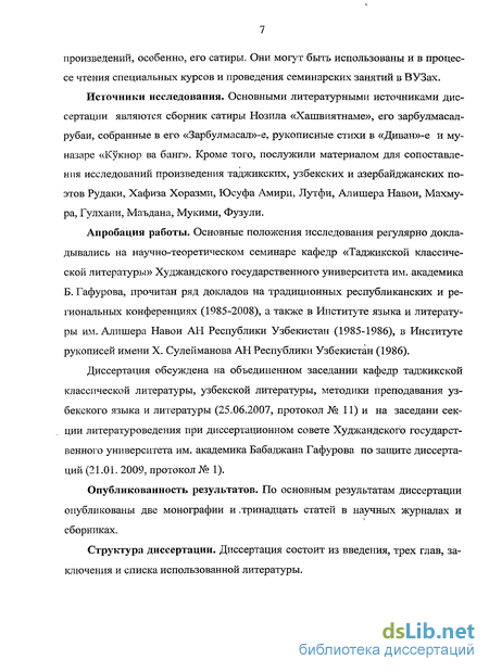 Источники исследования. Основными литературными источниками диссертации являются сборник сатиры Нозила «Хашвиятнаме», его зарбулмасал-рубаи, собранные в его «Зарбулмасал»-е, рукописные стихи в «Диван»-е и му-назаре «Кукнор ва банг». Кроме того, послужили материалом для сопоставления исследований произведения таджикских, узбекских и азербайджанских поэтов Рудаки, Хафиза Хоразми, Юсуфа Амири, Лутфи, Алишера Навои, Махму-ра, Гулхани, Маъдана, Мукими, Фузули.