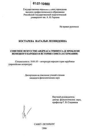 Настоящая работа посвящена жанру сонета в творческом наследии Андреаса Грифиуса (1616 - 1664), истории сонета в Германии и проблемам немецкого барокко.