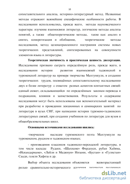 Выбор объекта исследования объясняется всёвозрастаю-щей ролью сравнительно-исторического изучения литератур различных народов в общелитературном процессе, путей развития литературы у разных народов и литературных взаимосвязей. Общеизвестно, что сравнительный анализ предполагает, прежде всего, наличие двух объектов, которые подлежат сопоставлению. В данной работе объектом сравнительного изучения является рассмотрение взаимоотношений и взаимовлияний таджикской и туркменской литератур на примере произведений выдающегося туркменского поэта Махтумкули.