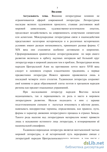 Актуальность темы. Внешние литературные влияния не ограничиваются сферой современной литературы. Литературное наследие великих художников прошлого, ставшее достоянием всей мировой цивилизации, художественно-эстетическим опытом, продолжает воздействовать на современность созвучными элементами или аспектами. Международные литературные связи и взаимодействия представляют категорию историческую и в различных исторических условиях имеют разную интенсивность, принимают разные формы. С XIX века они становятся особенно активными и широкими. Сформировавшееся сравнительное литературоведение по мере своего развития включало в орбиту научных интересов всё больший круг литератур мира и широкий диапазон тем и проблем. Литературная жизнь народов Центральной Азии на протяжении почти всего XVII века следует в основном старым классическим традициям, а первые предвестники литературы Нового времени проявляются лишь в последней четверти этого столетия. Таджикская литература сохраняет своё влияние в среде образованной элиты поэтов и прозаиков народов региона как предмет изысканных упражнений.