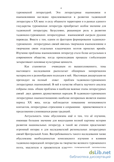 Как становится очевидным из вышеизложенного, тема настоящего исследования располагает обширным эмпирическим материалом и разнообразием подходов к ней. Настоящая диссертация не претендует на полный охват проблем таджик-ско-туркменских литературных взаимосвязей. В ней в качестве объекта научного анализа избраны лишь общие проблемы и наиболее важные этапы литературных связей двух древних дружественных народов. В таджикско-туркменских литературных взаимоотношениях наиболее интересным является именно период ХХ века, когда наблюдается повышение интенсивности литературных контактов, стремление к сохранению преемственности и продолжению сложившихся ранее традиций.