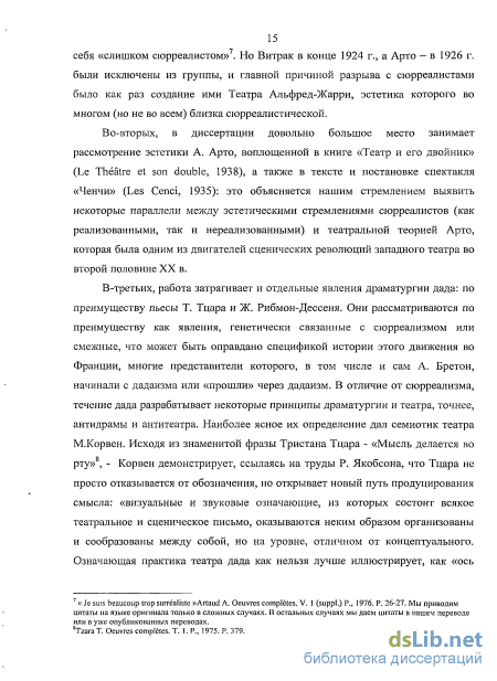 Апробация работы. Основные положения диссертационного исследования изложены в докладах на академических (РАН), межвузовских и международных конференциях в Москве, Санкт-Петербурге, Париже, Клермон-Ферране, Шамбери, Нанте, Бремене, Дюссельдорфе, Люксембурге и др. (более 40 конференций), на исследовательских семинарах ИМЛИ РАН, РГГУ, МГУ, НЦНИ Франции, университетов Франции и Германии, и др, в 70 научных публикациях на русском, французском и немецком языках, напечатанных в России, Франции, Германии, Швейцарии, Нидерландах, в том числе в российских и иностранных журналах, рекомендованных ВАК. В связи с работой над диссертацией автор занималась научным составлением трудов в России и во Франции и была их ответственным редактором: «Антология французского сюрреализма», М., ГИТИС, 1994, совм. с С.А. Исаевым; специальный номер французского журнала «Critique», Paris, 2001, № 644-645, совм. с В. Береловичем; Специальный номер журнала «Cahiers d’histoire culturelle», Tours, № 10, 2001, совм. с М.-К. Отан-Матье и Э.Анри; «Превратности выбора», М., РИО МГК, 2004, совм. с Т.В. Балашовой и Ж.Шеньо-Жандрон; «От текста – к сцене», М., ОГИ, 2006, совм. с М.-К. Отан-Матье; «Энциклопедический словарь сюрреализма», М., ИМЛИ, 2007, совм. с Т.В. Балашовой, для которого автор диссертации написала также 52 статьи, объем которых занимает около одной пятой объема словаря, и др. Материал диссертации использовался в общих и специальных курсах по истории и теории литературы, прочитанных автором в Российской Академии театрального искусства (1992-1994), Российском Гуманитарном Университете (2001), Франко-российском университетском Колледже (1997, 2004) а также в Российском Государственном Гуманитарном Университете (с 2004 г. по наст. вр.) и учтен в двух учебно-методических комплексах, опубликованных в РГГУ в 2008 г.