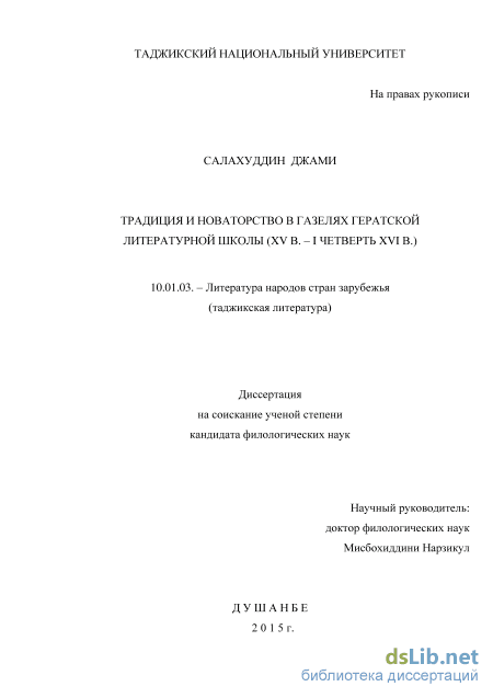 Актуальность темы. Споры о проблемах традиций, новаторства и путях создания произведений искусства и литературы среди ученых- литературоведов и искусствоведов ведутся давно. С данными проблемами тесно связаны вопросы влияния, воздействия и взаимовлияния в искусстве и литературе. Эти проблемы и размышления по ним возникали в различные периоды развития этих искусств и продолжаются до сих пор во всех мировых литературах, в том числе и в персидско-таджикской литературной среде. В истории персидской и таджикской литератур период XVв.-I четверти XVIв. является весьма интересным, плодотворным и спорным. Мнения ученых-литературоведов в оценке этого периода развития названных литератур кардинально расходятся. Большинство иранских ученых данный период в литературе считают подражанием, некоторые даже чистым копированием стиля предыдущих периодов развития этих литератур. Так, иранский ученый Сирус Шамисо считает литературу, в том числе и поэзию, XVв. началом кризиса, упадка персидско-таджикской литературы. Таджикские и афганские литературоведы же считают этот период блестящим, плодотворным и в какой-то степени новаторским. В целях разрешения этой проблемы тема данного диссертационного исследования была определена как «Традиция и новаторство в газелях гератской литературной школы (XVв. - I четверть XVIв.)». Данная тема является весьма актуальной не только для таджикского и афганского литературоведения, но и всей иранистики, ибо точное и ясное определение границ традиции, а также новаторства в поэзии исследуемого периода даст возможность правильно оценить поэзию XVв. и вклад поэтов в развитие литературы.