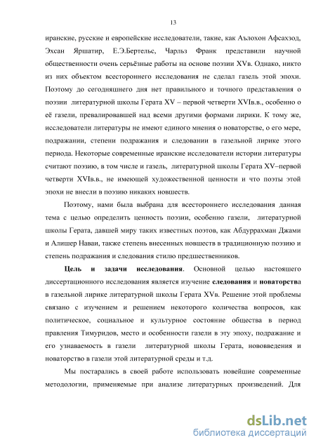 Цель и задачи исследования. Основной целью нашего диссертационного исследования является изучение следования и новаторства в газельной лирике гератской литературной школы XVв. Решение этой проблемы связано с изучением и решением таких вопросов, как политическое, социальное и культурное состояние общества в период правления тимуридов, место и особенности газели в эту эпоху, подражание и его узнаваемость в газели гератской литературной школы, новаторство в газели этой литературной среды и т.д.