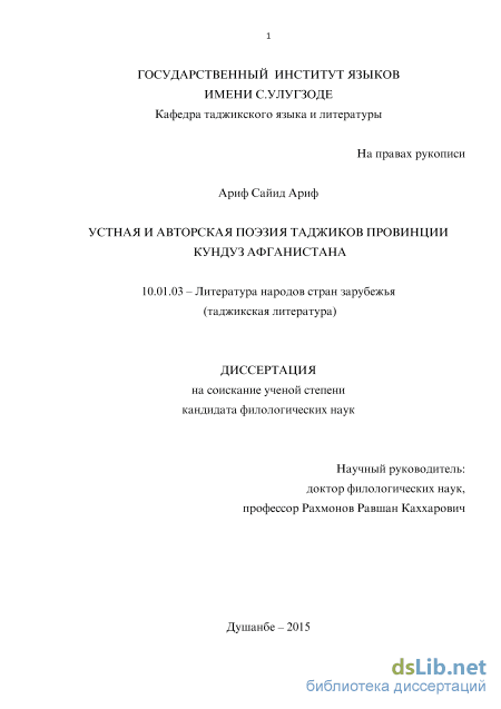 Апробация работы. Диссертация обсуждена на заседаниях кафедры языка и литературы Государственного института языков имени С. Улугзоде (протокол №9 от 11 апреля 2015 г.) и кафедры теории и современной персидско-таджикской литературы ТНУ (протокол №34 от 10 июня 2015 г.). Некоторые вопросы исследования были представлены в форме научных докладов на научных конференциях в Афганистане и за рубежом: «Фольклор Кундуза» (Кабул, 2011), «Изображение любви в простонародных четверостишиях» (Тегеран, 2011), «Местные певцы провинции Кундуз» (Индия, 2011), «Мир в устной поэзии Афганистана» (Испания, 2013), «Творчество местных поэтов провинции Кундуз» (Нидерланды, 2013). Автор также участвовал и выступал с докладами на конференциях в Таджикистане, где по исследуемой теме опубликован ряд статей.