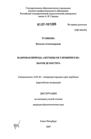 9 прозаическое произведение, является романом. Отдельного исследования, посвященного жанровой структуре произведения, не существует, хотя вопрос о жанровой принадлежности книги неизбежно возникает в любом исследовании: «Наверное, ни одно из великих произведений мировой литературы не вызывало у исследователей столь щедрого желания непременно отыскать аналогии, источники и т.п., как "Легенда об Уленшпигеле" Де Костера. Причина этого, очевидно, в на редкость оригинальном характере ее, в чрезвычайной сложности художественной формы, в пестроте стиля» (Мицкевич, 102). В связи с несомненно сложной жанровой природой книги исследователи обращают внимание не на совокупность черт и признаков, а на один или несколько признаков. В результате этого ученые либо пытаются однозначно определить жанровую природу, либо ограничиваются общими фразами о смешении жанровых традиций ради создания монументального полотна (иногда две эти точки зрения парадоксальным образом соединяются). Кроме того, работы о «Легенде» пестрят фигуральными определениями жанровой природы, не имеющими под собой никакого обоснования: «Произведение Де Костера трудно отнести к какому-либо определенному жанру; это - книга-эпопея, книга-поэма, "библия Бельгии", звучащая как симфония», пишет И.Н. Пожарова (Пожарова 1964: 573), в то же время называя ее романом. В работе Мицкевича мы можем встретить разные определения книги - как эпопеи, исторического романа, легенды, причем каждый раз исследователь обосновывает свое мнение. Тем не менее общеупотребимым обозначением «Легенды» служит жанр романа как самого неопределенного жанра, в рамки которого можно уместить практически все.
