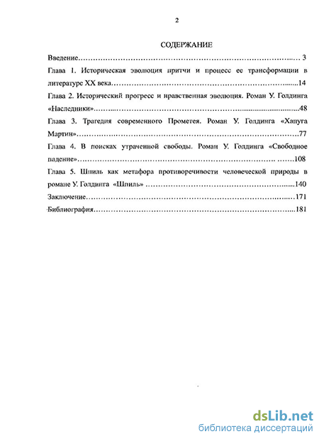 настоящей работе явились лишь четыре произведения автора, написанные в этот период - это романы: «Наследники», «Хапуга Мартин», «Свободное падение» и «Шпиль». Роман «Повелитель мух» исключен из этого перечня, поскольку в англо-американской и отечественной критике существует большое число работ о первой книге Голдинга, в которых были рассмотрены практически все аспекты этого произведения. Данная работа ограничивается лишь кратким анализом «Повелителя мух», являющимся скорее обобщением уже имеющейся критической литературы, нежели самостоятельным исследованием. Ограниченный объем диссертации не позволяет охватить весь цикл романов Уильяма Голдинга 1950-1960-х годов. Настоящее исследование вынуждено ограничиться анализом четырех романов, представляющих наибольший интерес с точки зрения изучения их жанровой специфики в целом, и особенностей преломления притчевого начала в каждом из романов в частности. Роман «Пирамида», вышедший в 1967 году, открыл новую совершенно неожиданную грань таланта Голдинга как создателя ярких, сатирически емких зарисовок быта и нравов английской провинции, однако по своим формальным и содержательным характеристикам «Пирамида» не может быть отнесена к жанру «романа-притчи», а, следовательно, анализ романа не предусмотрен в диссертации.