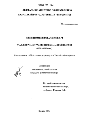 Апробация диссертации. Диссертация обсуждена на кафедре калмыцкой литературы Калмыцкого государственного университета и рекомендована к защите по специальности 10.01.02 - Литература народов Российской Федерации.