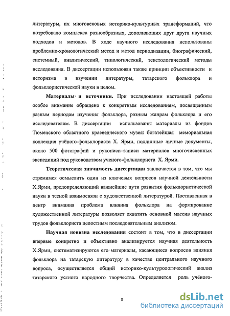 литературы, их многовековых историко-культурных трансформаций, что потребовало комплекса разнообразных, дополняющих друг друга научных подходов и методов. В ходе научного исследования использованы проблемно-хронологический метод и метод периодизации, биографический, системный, аналитический, типологический, текстологический методы исследования. В диссертации использован также принцип объективности и историзма в изучении литературы, татарского фольклора и фольклористической науки в целом.