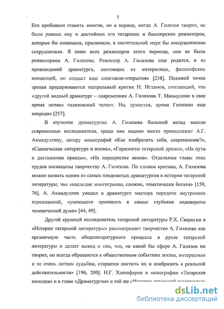 Другой крупный исследователь татарской литературы Р.Х. Сверигин в «Истории татарской литературы» рассматривает творчество А. Гилязова как органичную часть общелитературного процесса в русле татарской литературы и делает вывод о том, что, «в какой бы сфере А. Гилязов ни творил, он всегда обращается к общественным событиям жизни, интересным и не очень легким судьбам, старается постичь их и изобразить в реальной действительности» [196, 200]. Н.Г. Ханзафаров в монографии «Татарская комедия» и в главе «Драматургия» в той же «Истории татарской литературы»