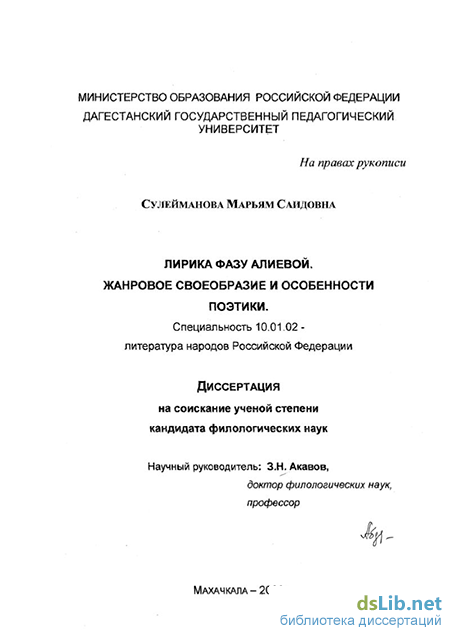 В дагестанском литературоведении изучению творчества Фазу Алиевой посвящен целый рад исследований различного характера Это многочисленные статьи, предисловия к поэтическим сборникам, кри-тико-бнографические очерки, разделы монографий, главы научных трудов и т.д. Однако многогранное творчество поэтессы остается по-прежнему неизученным в монографическом плане. Этим обусловливается обращение автора диссертационной работы к творчеству Ф. Алиевой, к анализу специфики еа творчества.