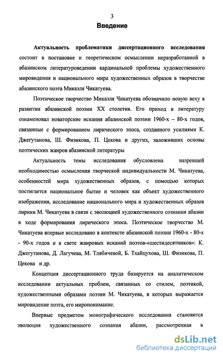 Актуальность темы исследования обусловлена назревшей необходимостью осмысления творческой индивидуальности М. Чикатуева, особенностей мира художественных образов, с помощью которых постигается национальное бытие и человек как объект художественного изображения, исследование национального мира и художественных образов лирики М. Чикатуева в связи с эволюцией художественного сознания абазин в ходе формирования лирического эпоса. Поэтическое творчество М. Чикатуева впервые исследовано в контексте абазинской поэзии 1960-х - 80-х - 90-х годов и в свете жанровых исканий поэтов-«шестидесятников»: К. Джегутанова, Д. Лагучева, М. Тлябичевой, Б. Тхайцухова, Ш. Физикова, П. Цекова и др.