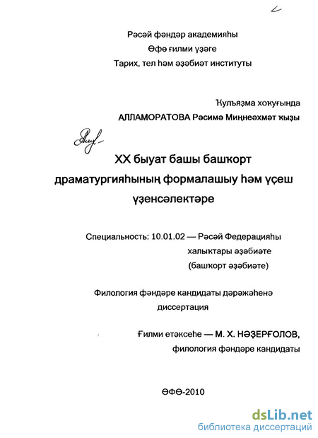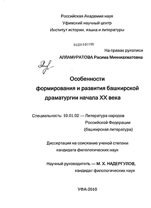 Научно-теоретическое и практическое значение исследования. Материалы диссертации, основные ее положения могут быть использованы при разработке отдельных проблем истории башкирской литературы, при составлении учебных и учебно-методических пособий по изучаемой проблеме, а также в процессе преподавания башкирской литературы начала ХХ века в высших учебных заведениях, колледжах и школах. Проведенное исследование, по мнению диссертанта, существенно расширяет представление о башкирской драматургии начала ХХ века.