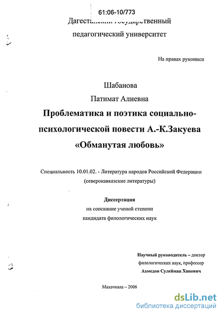 Как видим, сделано немало для исследования повести с разных точек зрения. И это позволяет проанализировать социально-психологическую повесть А.К.Закуева «Обманутая любовь» комплексно.