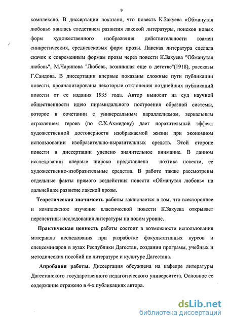 Научная новизна диссертации состоит в том, что впервые в дагестанском литературоведении данное произведение изучается комплексно. В диссертации показано, что повесть К.Закуева «Обманутая любовь» явилась следствием развития лакской литературы, поисков новых форм художественного изображения действительности взамен синкретических, средневековых форм прозы. Лакская литература сделала скачок к современным формам прозы через повести К.Закуева "Обманутая любовь", М.Чаринова "Любовь, возникшая еще в детстве"(1918), рассказы Г.Саидова. В диссертации впервые показаны сложные пути публикации повести, проанализированы некоторые отклонения позднейших публикаций повести от ее издания 1935 года. Автор выносит на суд научной общественности идею пирамидального построения образной системы, которое в сочетании с универсальным параллелизмом, зеркальным отражением героев (по С.Х.Ахмедову) дает поразительный эффект художественной достоверности изображаемой жизни при экономном использовании изобразительно-выразительных средств. Этой стороне повести в диссертации уделено значительное внимание. В данном исследовании впервые широко представлена поэтика повести, ее художественно-изобразительные средства. В работе также рассмотрены отдельные факты прямого воздействия повести «Обманутая любовь» на дальнейшее развитие лакской прозы.
