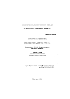 Корж Ирина Владимировна. Публицистика Дмитрия Трунова : диссертация ... кандидата филологических наук : 10.01.02.- Махачкала, 2001.- 188 с.: ил. РГБ ОД, 61 01-10/827-5