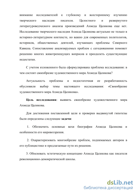 Некоторые проблемы, поднимаемые Ахмедом Цаликовым, не получили своего разрешения по сей день, что усиливает актуальность исследования его творческого наследия. Актуальность диссертационной работы подкрепляется также тем, что Ахмед Цаликов – это «одна из самых ярких фигур не только Осетии, Северного Кавказа, но и России… Его блестящие публицистические и литературно-критические статьи, стихотворения, рассказы систематически печатались во многих журналах и газетах Северного Кавказа, Москвы, Петербурга, Тбилиси, Казани, в различных сборниках и альманахах».2 В своих произведениях Ахмед Цаликов писал не только о событиях в Осетии, но и о судьбах многих других народов России, поднимая проблемы межнационального и межконфессионального взаимодействия, справедливого социального устройства, положения женщины в обществе и др. и предлагая оригинальные, хотя и не бесспорные, пути их решения.