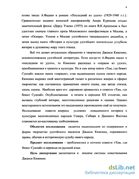Структура диссертации. Диссертационное исследование, раскрывающее авторскую концепцию творчества Джанси Кимонко как основоположника удэгейской литературы, состоит из введения, трёх глав, заключения, библиографического списка использованной литературы, включающего 201 наименование, и двух приложений. Основная часть работы изложена на 169 стр. машинописного текста.