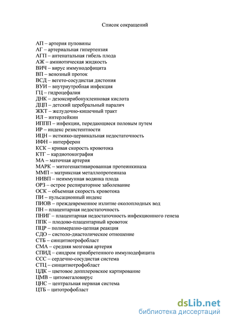 Ультразвуковая плацентография включала определение локализации плаценты, измерение ее толщины, степени зрелости и оценку ее структурных изменений. Степень зрелости плаценты устанавливали по классификации P. Grannum [250]. Оценка эхоструктуры плаценты включала: определение наличия участков локальных расширений межворсинчатого пространства (разнообразных по эхогенности, ассоциированных с тромбозами); обнаружение очагов с повышенной эхогенностью (ассоциированных с инфарктами); наличия деформаций и утолщений базального слоя (прерывистость и нелинейность отражений). Количество околоплодных вод оценивали путем вычисления амниотического индекса и сопоставления с нормативными показателями, а также субъективно [102]. Маловодие диагностировалось при амниотическом индексе менее 5 перцентиля (карман менее 2 см), а многоводие — при амниотическом индексе более 95 перцентиля (более 8 см). Исследования проводились на сроках: 18-21, 32-34 неделях беременности, а также по показаниям (угроза прерывания беременности, отставание в развитии плодного яйца, задержка развития плода, отслойка хориона/плаценты и др.). Согласно рекомендациям ISUOG по безопасности проведения допплерометрических исследований в акушерстве использованы предварительные настройки, при которых тепловой индекс (TI) должны быть 1.0, а время исследования не превышало 10-15 минут. В ходе работы использовались спектральный допплер, цветовое картирование кровотока и энергетический допплер [220, 288]. Системное программное обеспечение использованных приборов предоставляло возможность оценить как максимальную систолическую скорость (МСС) и максимальную диастолическую скорость (МДС) кровотока. При этом исследование производилось, когда плод не совершал ни дыхательных, ни прочих движений. В отдельных случаях рекомендовалась кратковременная задержка дыхания беременной. Угол допплеровского сигнала во всех случаях старались получить наиболее острый. При исследовании средней мозговой артерии во всех случаях угол составлял менее 20 градусов. Во всех исследованиях первично использовался фильтр 50-60 Гц с целью устранения низкочастотных шумов от периферических кровеносных сосудов. При регулировке скорости горизонтальной развертки он обычно составлял от 4 до 7 сердечных циклов, скорость устанавливалась в диапазоне от 50 до 100 мм в секунду [220, 288]. С целью полной воспроизводимости допплеровских измерений в отдельных случаях исследование повторялось. Часто для большей точности воспроизведения кривой ЦДК и 2D режима отключались после полного подтверждения правильного расположения допплеровских ворот и аудиоконтролем. Во всех случаях старались не инвертировать изображение и избегать артефактов. Маточная артерия оценивалась нами при помощи допплера трансабдоминально по боковым поверхностям матки в парацервикальных областях. При этом датчик помещался продольно в нижнем боковом квадранте под углом медиально. Для отличия маточной артерии от дугообразной артерии или шеечно-влагалищной артерии принимались за истинную скорость значения свыше 50 см в секунду, что типично для маточной артерии, особенно в начале 2-го триместра беременности. Корректировки в оценке показателей маточного кровотока, обусловленных аномалиями развития матки, не производили ввиду отсутствия таких пациентов. Измерен