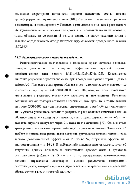 Рентгенологическое исследование в настоящее время остается основным методом диагностики и контроля эффективности лучевой терапии периферического рака легкого [5,11,14,25,52,54,57,66,127]. Классическое описание регрессии опухолевого очага при проведении лучевой терапии дано в работе А.С. Павлова с соавторами: «Сдвиги в рентгенологической симптоматике отмечаются при дозе 2500-3000-4000 рад. Шаровидная тень постепенно уменьшается в размерах, теряет свою плотность и интенсивность. Бугристые полициклические контуры становятся нечеткими. Как правило, к концу лечения при дозе 6500-6700 рад тень перестает определяться, в этой области отмечается лишь участок усиленного легочного рисунка. У ряда больных отмечается полное обратное развитие к концу курса лечения, в некоторых случаях полное обратное развитие опухоли наступает через 2 месяца после лечения» [73]. Однако столь яркая рентгенологическая картина наблюдается далеко не всегда. Значительный разброс в приводимых различными авторами результатах лучевой терапии рака легкого (положительный эффект - от 23 до 65 %, отсутствие эффекта или прогрессирование - в 10-58 % наблюдений) красноречиво свидетельствует об отсутствии единых подходов и значительном субъективизме в трактовке рентгенограмм (таблица 1). В связи с этим, предприняты многочисленные попытки определения достоверной оценки результатов контрольной рентгенографии, которые сводятся к двум основным направлениям: определению объема опухоли и ее оптической плотности.