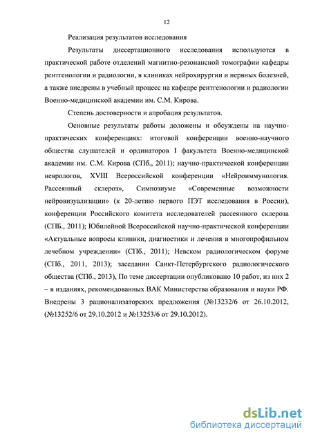 Основные результаты работы доложены и обсуждены на научно-практических конференциях: итоговой конференции военно-научного общества слушателей и ординаторов I факультета Военно-медицинской академии им. СМ. Кирова (СПб., 2011); научно-практической конференции неврологов, XVIII Всероссийской конференции «Нейроиммунология. Рассеянный склероз», Симпозиуме «Современные возможности нейровизуализации» (к 20-летию первого ПЭТ исследования в России), конференции Российского комитета исследователей рассеянного склероза (СПБ., 2011); Юбилейной Всероссийской научно-практической конференции «Актуальные вопросы клиники, диагностики и лечения в многопрофильном лечебном учреждении» (СПб., 2011); Невском радиологическом форуме (СПб., 2011, 2013); заседании Санкт-Петербургского радиологического общества (СПб., 2013).