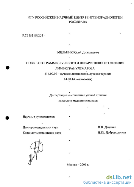Мельник Юрий Дмитриевич. Новые программы лучевого и лекарственного лечения лимфогранулематоза : диссертация ... кандидата медицинских наук : 14.00.19 / Мельник Юрий Дмитриевич; [Место защиты: ФГУ "Российский научный центр рентгенорадиологии"].- Москва, 2006.- 106 с.: ил.
