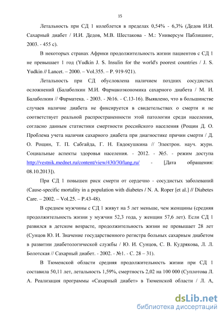 Летальность при СД обусловлена наличием поздних сосудистых осложнений (Балаболкин М.И. Фармакоэкономика сахарного диабета / М. И. Балаболкин // Фарматека. - 2003. - №16. - С. 13-16). Выявлено, что в большинстве случаев наличие диабета не фиксируется в свидетельствах о смерти и не соответствует реальной распространенности этой патологии среди населения, согласно данным статистики смертности российского населения (Рощин Д. О. Проблема учета наличия сахарного диабета при диагностике причин смерти / Д. О. Рощин, Т. П. Сабгайда, Г. Н. Евдокушкина // Электрон, науч. журн. Социальные аспекты здоровья населения. - 2012. - №5. - режим доступа http: //vestnik. mednet. ru/content/vie w/43 0/3 0/lang,ru/ - [Дата обращения: 08.10.2013]).