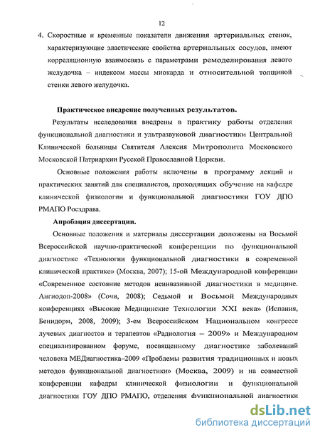 Основные положения и материалы диссертации доложены на Восьмой Всероссийской научно-практической конференции по функциональной диагностике «Технологии функциональной диагностики в современной клинической практике» (Москва, 2007); 15-ой Международной конференции «Современное состояние методов неинвазивной диагностики в медицине. Ангиодоп-2008» (Сочи, 2008); Седьмой и Восьмой Международных конференциях «Высокие Медицинские Технологии XXI века» (Испания, Бенидорм, 2008, 2009); 3-ем Всероссийском Национальном конгрессе лучевых диагностов и терапевтов «Радиология — 2009» и Международном специализированном форуме, посвященному диагностике заболеваний человека МЕДиагностика-2009 «Проблемы развития традиционных и новых методов функциональной диагностики» (Москва, 2009) и на совместной конференции кафедры клинической физиологии и функциональной диагностики ГОУ ДПО РМАПО, отделения функциональной диагностики