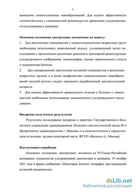 Апробация работы. Основные положения диссертации доложены на VI Съезде Российской ассоциации специалистов ультразвуковой диагностики в медицине, 19 октября 2011 года: «Некоторые аспекты эхографии при юношеской истинной гинекомастии».