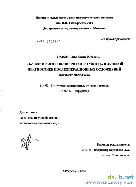 Определены значение, возможность и информативность различных рентгенологических методик, использующихся при диагностике и контроле эффективности лечения осложнений панкреонекроза, а также научно обоснована последовательность их применения у больных с осложнениями панкреонекроза в послеоперационном периоде.