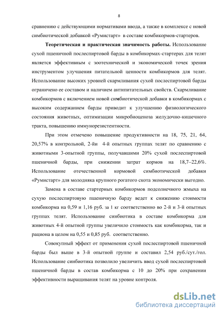 Научная новизна диссертационной работы. На выращиваемом молодняке крупного рогатого скота впервые изучена эффективность скармливания разных уровней сухой пшеничной послеспиртовой барды по сравнению с действующими нормативами ввода, а также в комплексе с новой симбиотической добавкой «Румистарт» в составе комбикормов-стартеров.