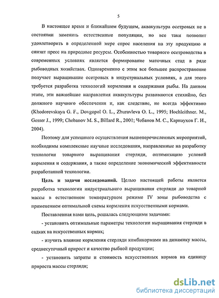 Цель и задачи исследований. Целью настоящей работы является разработка технологии индустриального выращивания стерляди до товарной массы в естественном температурном режиме IV зоны рыбоводства с применением оптимальной схемы кормления искусственными кормами.