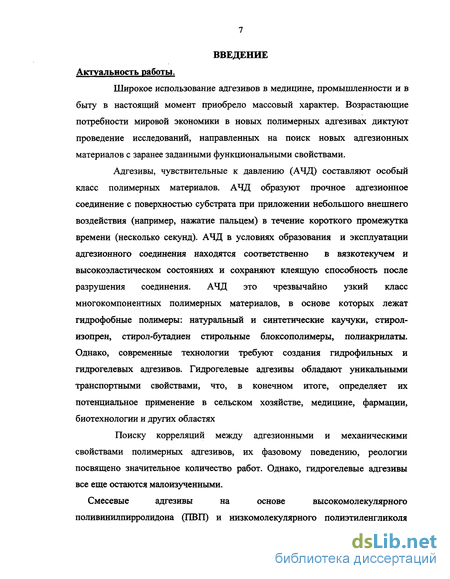 Ряд функциональных особенностей поведения систем ПВП-ПЭГ по сравнению с типичными АЧД, стимулировали интенсивные исследования ее свойств в течение последних десяти лет. В частности, получен и систематизирован значительный объем информации о природе межмолекулярных взаимодействий в системе, ее фазовом состоянии, диффузионной подвижности, влиянии воды на поведение системы и др. Однако, ряд вопросов, связанных с особенностями механического и адгезионного поведения, системы остаются неизученными. Поскольку адгезионные свойства тесно связаны с деформацией адгезива, сопровождающей как образование адгезионного соединения, так и его разрушение, исследования в этих областях позволяют не только оптимизировать свойства адгезива ПВП-ПЭГ, но и пролить свет на механизм функционирования адгезивов.
