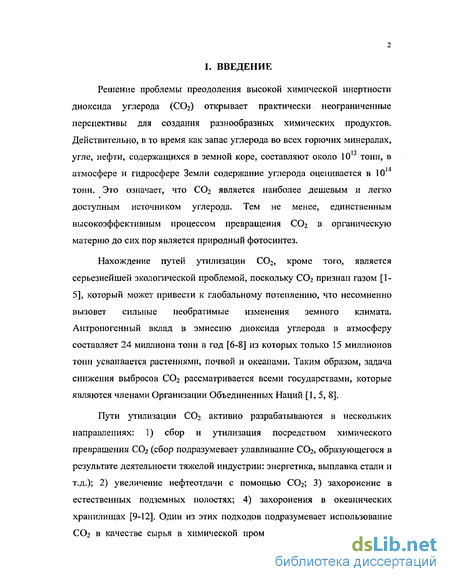 Нахождение путей утилизации С02, кроме того, является серьезнейшей экологической проблемой, поскольку СОг признан газом [1-5], который может привести к глобальному потеплению, что несомненно вызовет сильные необратимые изменения земного климата. Антропогенный вклад в эмиссию диоксида углерода в атмосферу составляет 24 миллиона тонн в год [6-8] из которых только 15 миллионов тонн усваивается растениями, почвой и океанами. Таким образом, задача снижения выбросов С02 рассматривается всеми государствами, которые являются членами Организации Объединенных Наций [1,5, 8].
