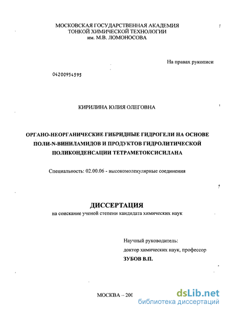 Такие системы, где непрерывная фаза - органический полимер, а дискретная фаза - неорганические наночастицы, мы предлагаем называть гибридными материалами. Гибридные материалы, полученные при проведении золь-гель-реакций в водном растворе полимера, будем называть органо-неорганическими гибридными гидрогелями (ОНГГ).